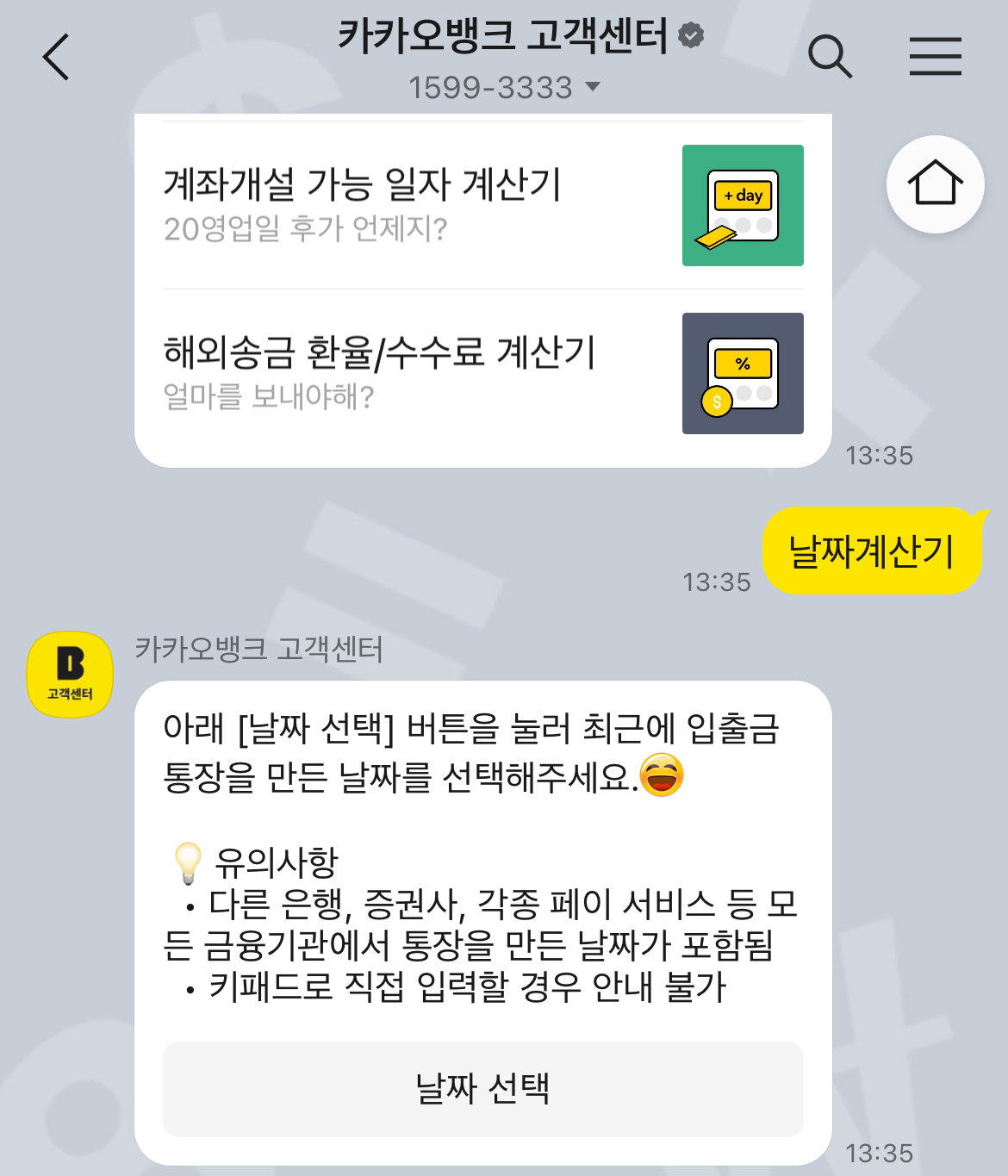 카카오톡 > 카카오뱅크 고객센터 추가 > 날짜계산기 > 통장개설일 입력